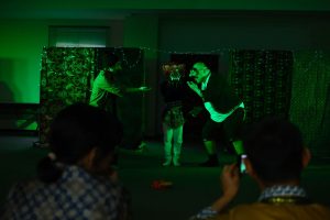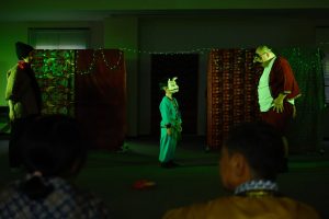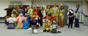 たんけんたいメンバーはみなバリの村人になって、好きな仮面を選び(仮面に選ばれ)、みなでトペン劇をつくりました。仮面をつけた自分を鏡で見て、どんなセリフを言いそうか、どんなキャラなのか、舞台にあがって即興劇!